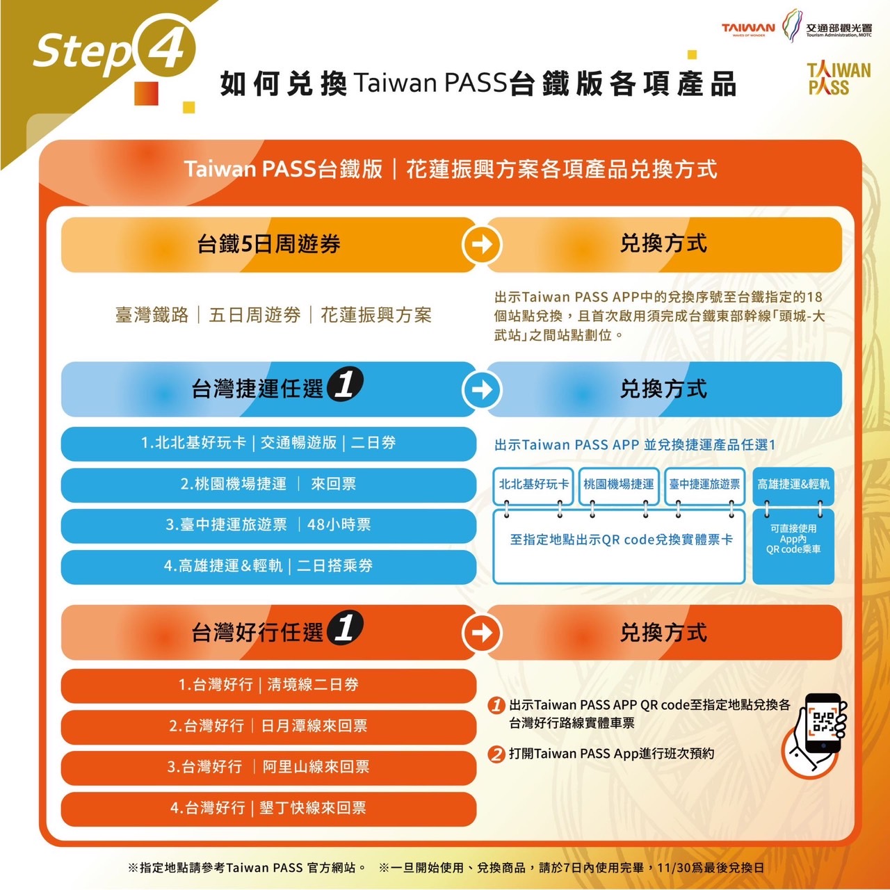 觀光署亦提醒,「Taiwan PASS-台鐵版(花蓮振興方案)」須至指定通路(Klook及雄獅旅行社網站)購買,下載Taiwan PASS App並輸入兌換序號即可開通。「台鐵五日周遊券」須至台鐵指定18個站點(臺東、花蓮、羅東、宜蘭、南港、松山、臺北、板橋、桃園、中壢、新竹、臺中、新烏日、嘉義、臺南、新左營、高雄、枋寮等)兌換,且首次啟用須完成台鐵東部幹線「宜蘭頭城-台東大武站」之間站點劃位,並於今(113)年11月30日完成開通與使用。產品適用車種為3000型自強號、普悠瑪、太魯閣、自強號、莒光號及區間(快)車,但除自強、莒光號及區間(快)車外,其他車種均須事先劃位確認擁有對號座才可搭乘。